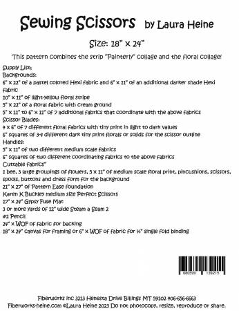 Sewing Scissors Collage Pattern by Laura Heine. This is the perfect addition for your sewing room with these Sewing Scissors. This quilt is a mix between painterly and collage. A great way to learn both techniques and a stunning collage for your wall. This pattern includes step by step color instructions to complete this quilt. Finished size 18"x24".