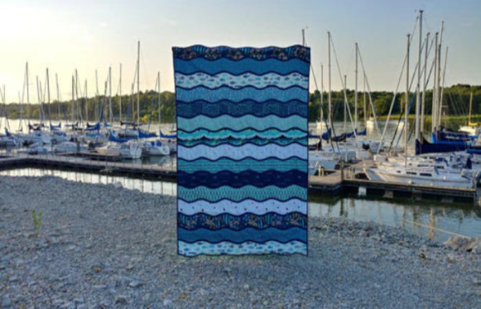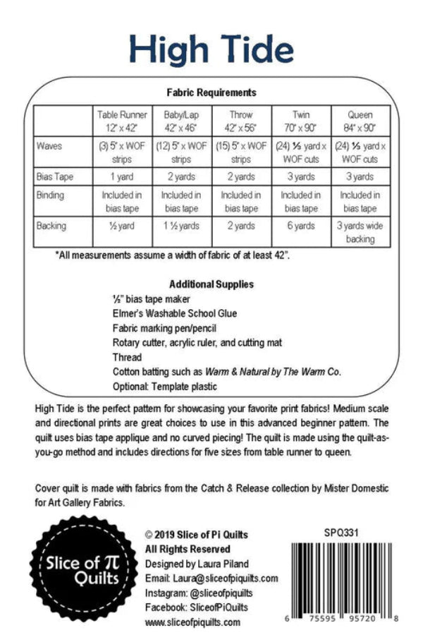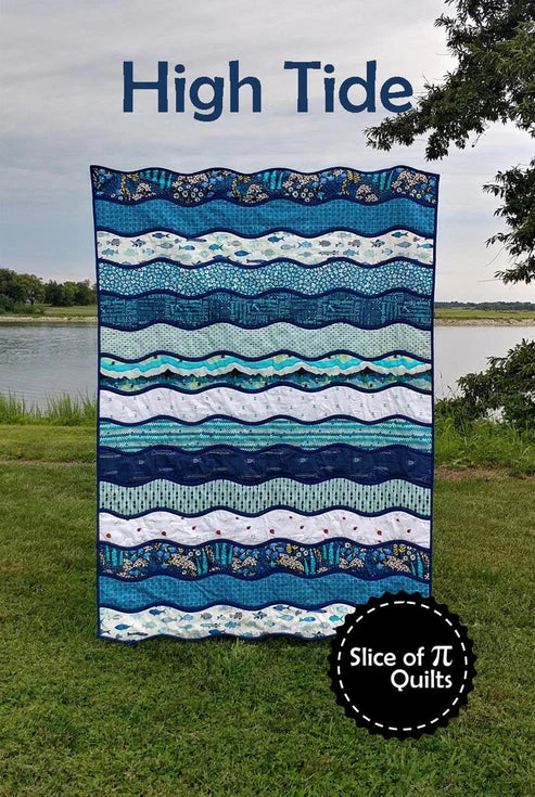 SLICE OF PI - High Tide Pattern is the perfect pattern for showcasing your favorite print fabrics! Medium scale and directional prints are great choices to use in this advanced beginner pattern. The quilt uses bias tape applique and no curved piecing! The quilt is made using the quilt-as-you-go method and includes directions for five sizes from table runner to queen.