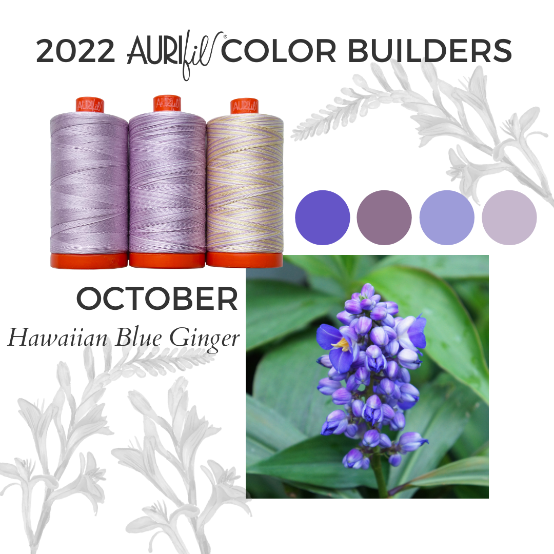 AURIFIL - Thread Color Builder FLORA: OCTOBER, Hawaiian Blue Ginger includes three shades of 50wt thread in 2510, 3840, & 4651, two variegated shades and one solid to help represent this cool bloom.