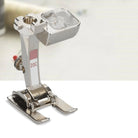 The wide opening at the front of the foot affords a clear view of the stitching area, while the wide wedge-shaped channel under the sole of the foot ensures perfect fabric feed even over dense stitch formations.