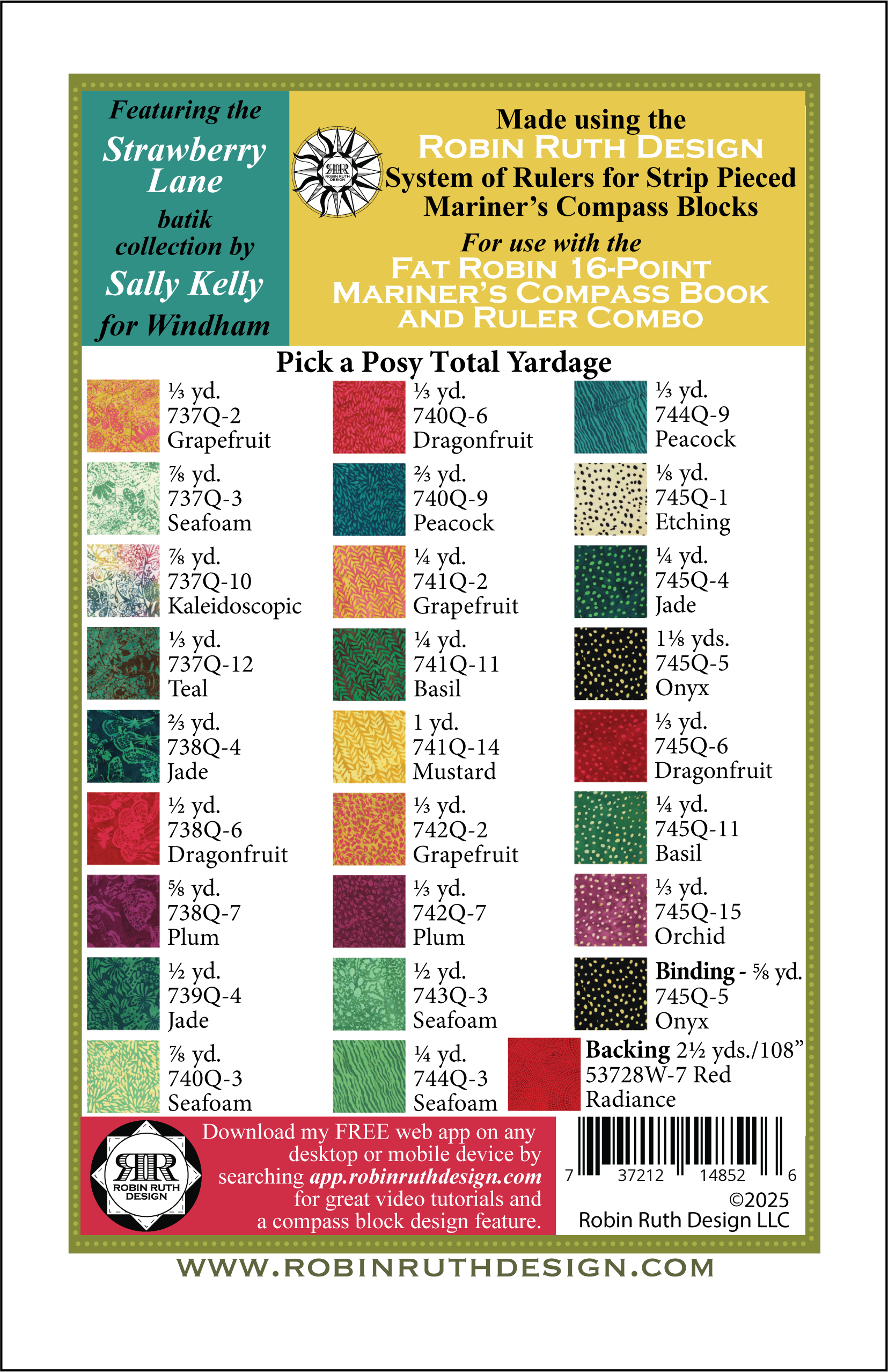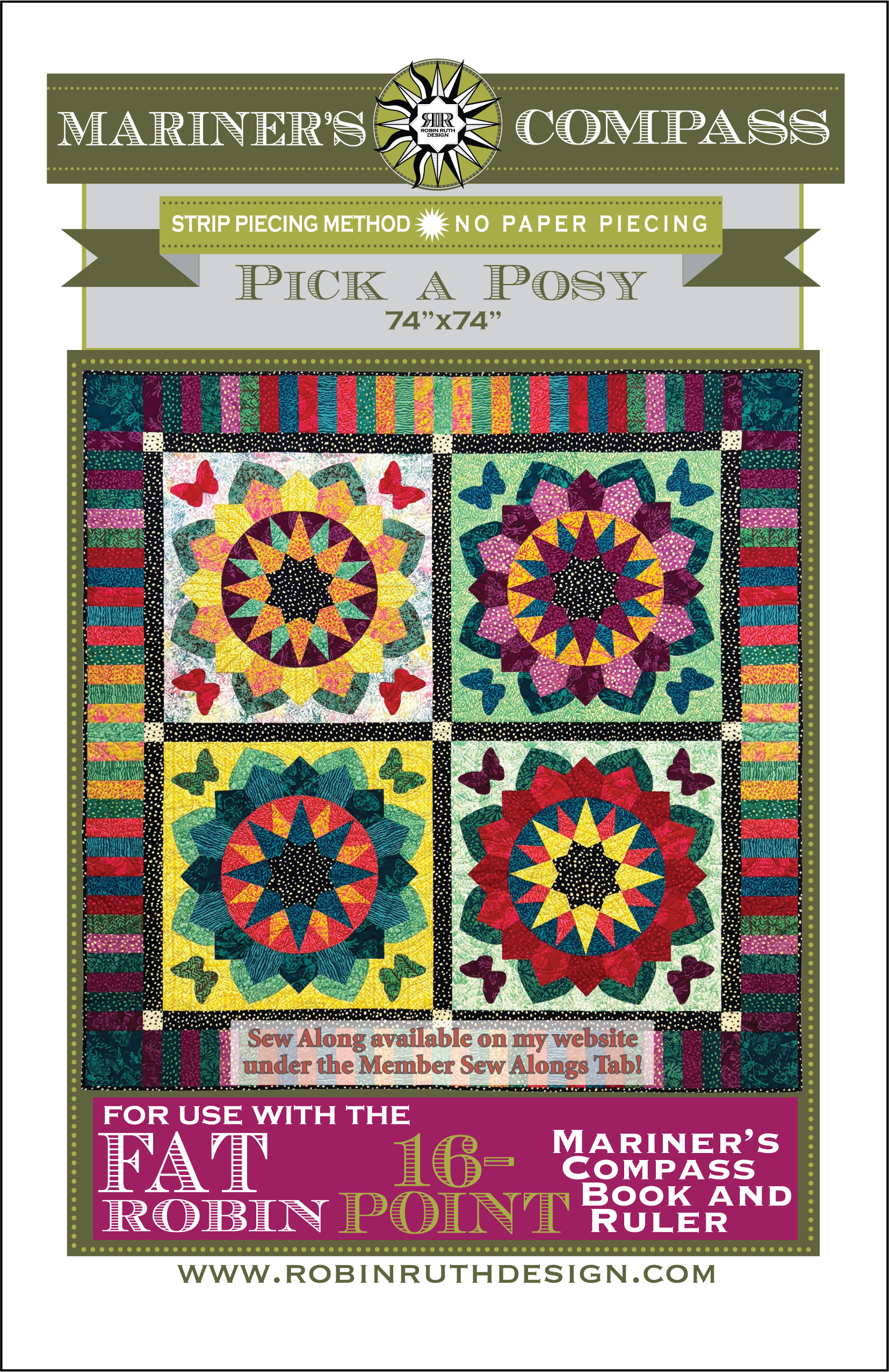 ROBIN RUTH DESIGNS - Pick a Posy Pattern creates quilt elements including four 16” Compass Sunflower blocks embellished with Dresden bands and faced appliqué petals. A radiating pieced border sets off these blocks. This is a great project to get started with my rulers!