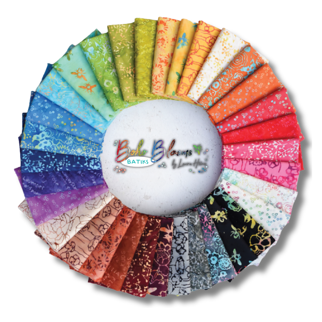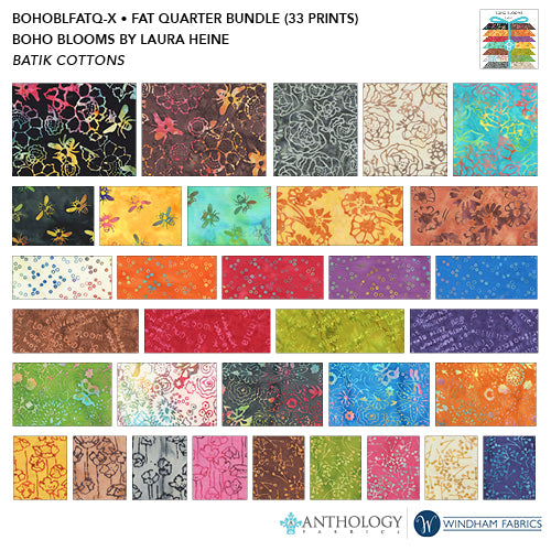 Laura Heine - Boho Blooms - Pre-cut Bundles presents 33 fabrics from Laura Heine's Boho Blooms Collection, a batik collection full of flowers, word collages, and bees.