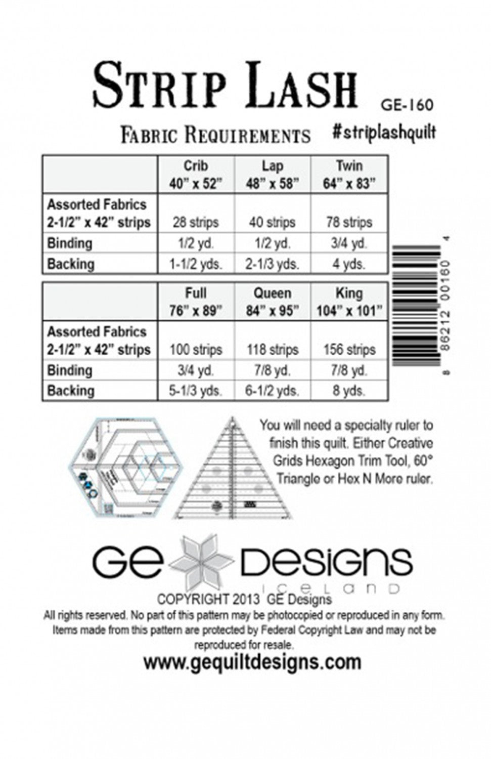 G. E. DESIGNS - Strip Lash is a quick and easy quilt made from 2-1/2" strips. The pattern offers 6 different sizes (crib, lap, twin, full, queen, king).