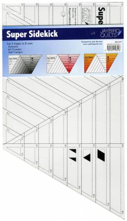 JAYBIRD QUILTS - Super Sidekick Ruler cuts diamonds, triangles and half triangles. Each ruler comes with full color directions. The Sidekick and Hex N More rulers can work together or alone. The shapes and sizes cut from each ruler can work together to make unique and interesting designs. All of the pieces can be rotary cut from strips.