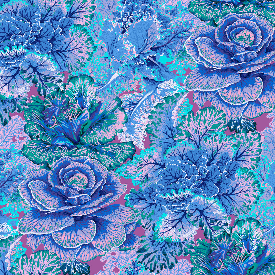 PHILIP JACOBS - KAFFE FASSET COLLECTIVE - STASH, Curly Kale, Blue showcases beautiful fabric by Kaffe Fassett.