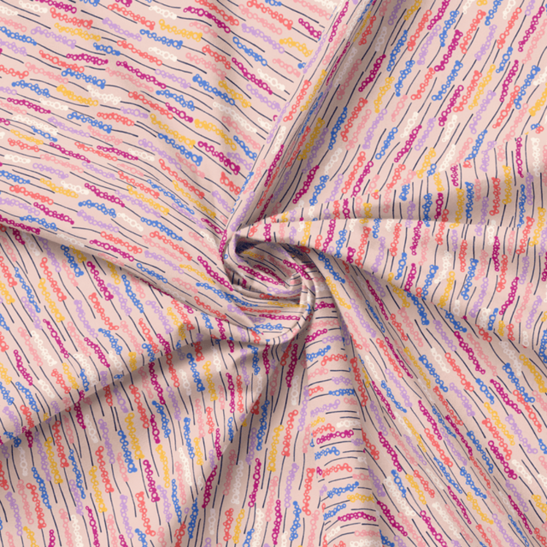 Set against a soft blush background, the vertical flow creates gentle movement and playful texture. This versatile coordinate pairs beautifully with the collection’s florals, adding color, contrast, and a whimsical touch to quilts and sewing projects.