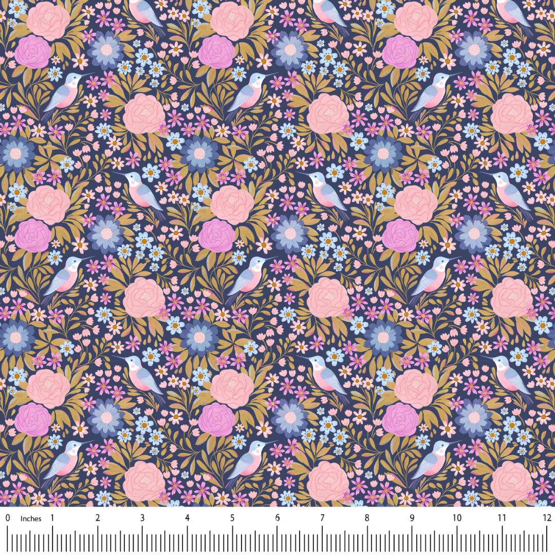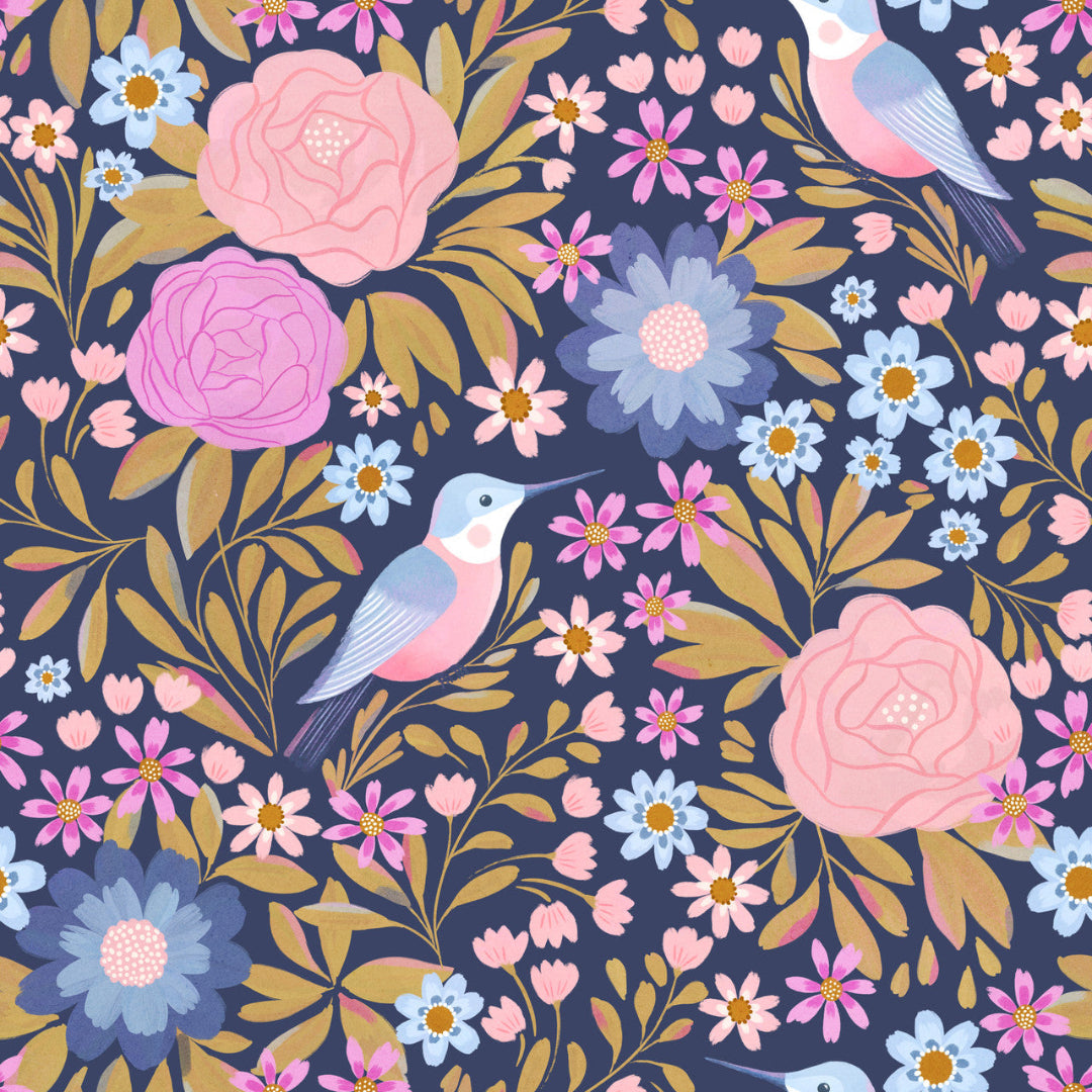MIA PRESLEY DESIGNS - Song of the Hummingbird - Hummingbird is part of the Song of the Hummingbird Collection, featuring graceful birds nestled among lush florals on a rich navy background.