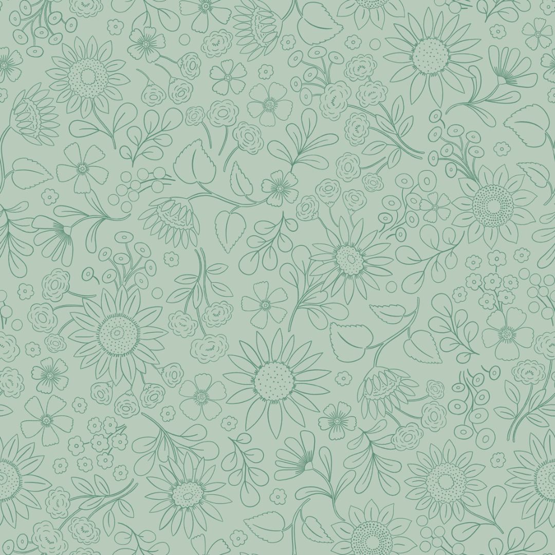 MIA PRESLEY DESIGNS - Sunflower Reverie - Pressed in Green is part of the Sunflower Reverie Collection, featuring delicate sunflower and wildflower outlines in soft green tones on a mint background.