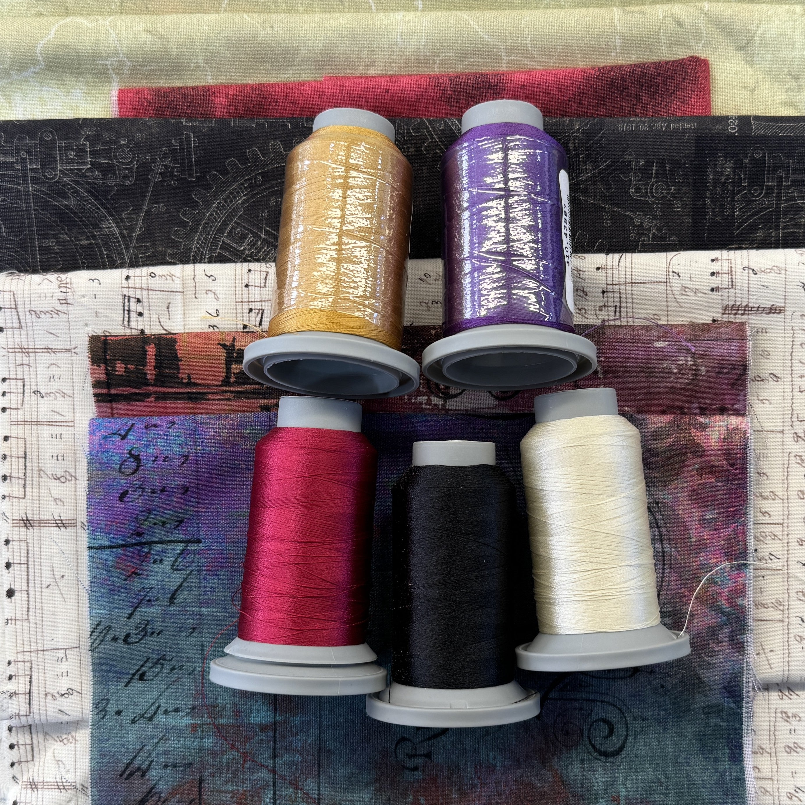The first block also includes 5 spools of Glide thread we used to compliment the fabrics.