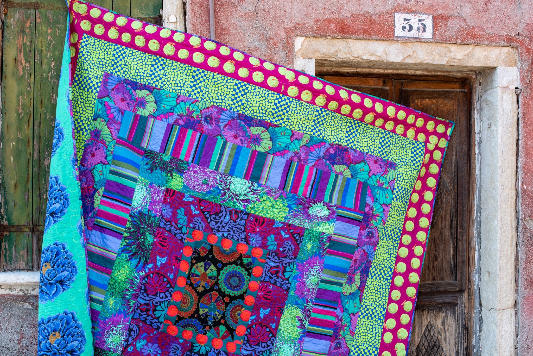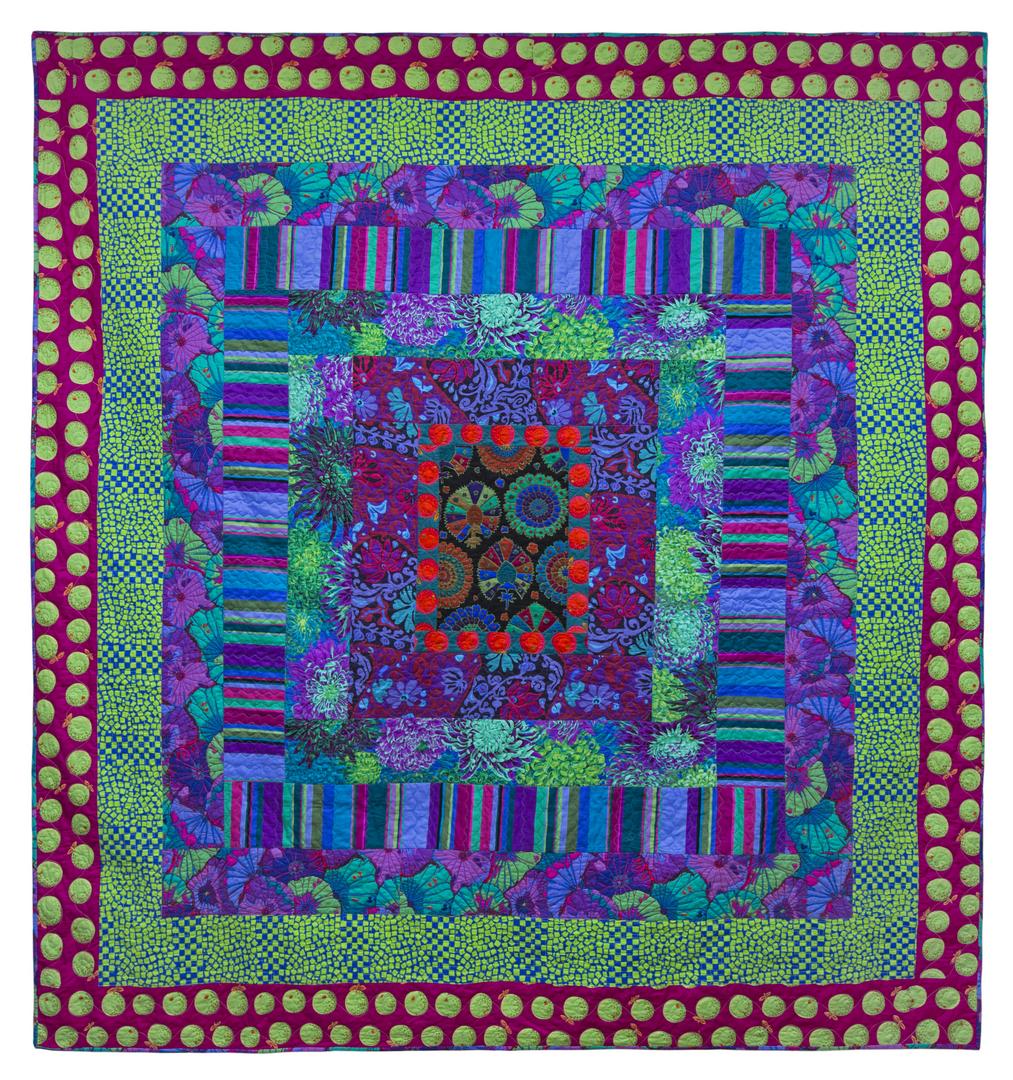 BRANDON MABLY - Quilts in Burano - GREEN WITH ENVY Quilt Kit displays a greenish background, primarily made up of green and blues. This creates the perfect foundation to add sharp contrasts that truly pop! Roman Tiles is a perfect mix of the designs Oranges, Chrysanthemum and others ! With Paper Fans as the backing, the vibrancy of primary colors adds a great spark of color!