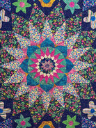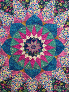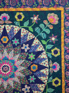 ROBIN RUTH - RADIANT GARDEN PATTERN (100”x100”) - This quilt features a center medallion composed of three nested compass variation blocks, with flower faced appliqué elements, and more flowers and leaves that radiate around the medallion.