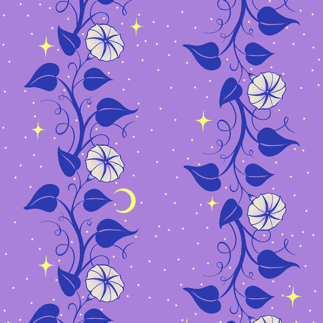 RUBY STAR SOCIETY - SARAH WATTS - Glow Garden - Moon Vines, Amethyst represents a whimsical celebration of magical nights and roller skating fun of fabrics from the Glow Garden Collection!