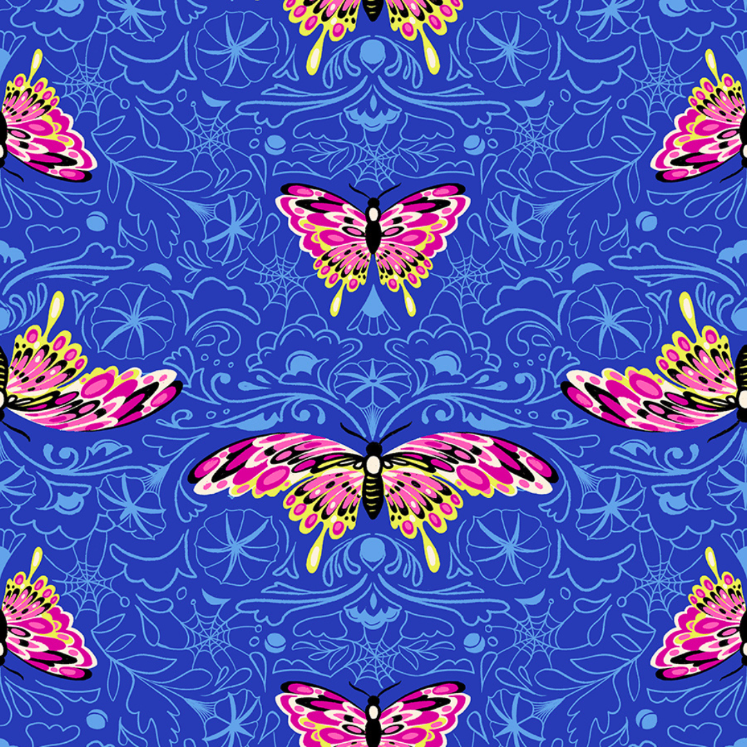 RUBY STAR SOCIETY - SARAH WATTS - Glow Garden - Morning Moth, Blacklight represents a whimsical celebration of magical nights and roller skating fun of fabrics from the Glow Garden Collection!
