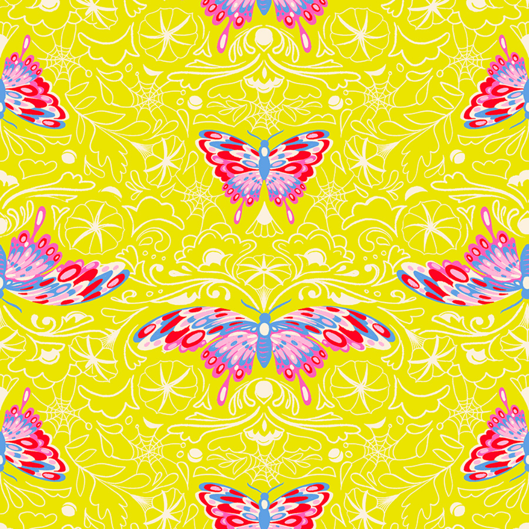 RUBY STAR SOCIETY - SARAH WATTS - Glow Garden - Morning Moth, Citron  represents a whimsical celebration of magical nights and roller skating fun of fabrics from the Glow Garden Collection!