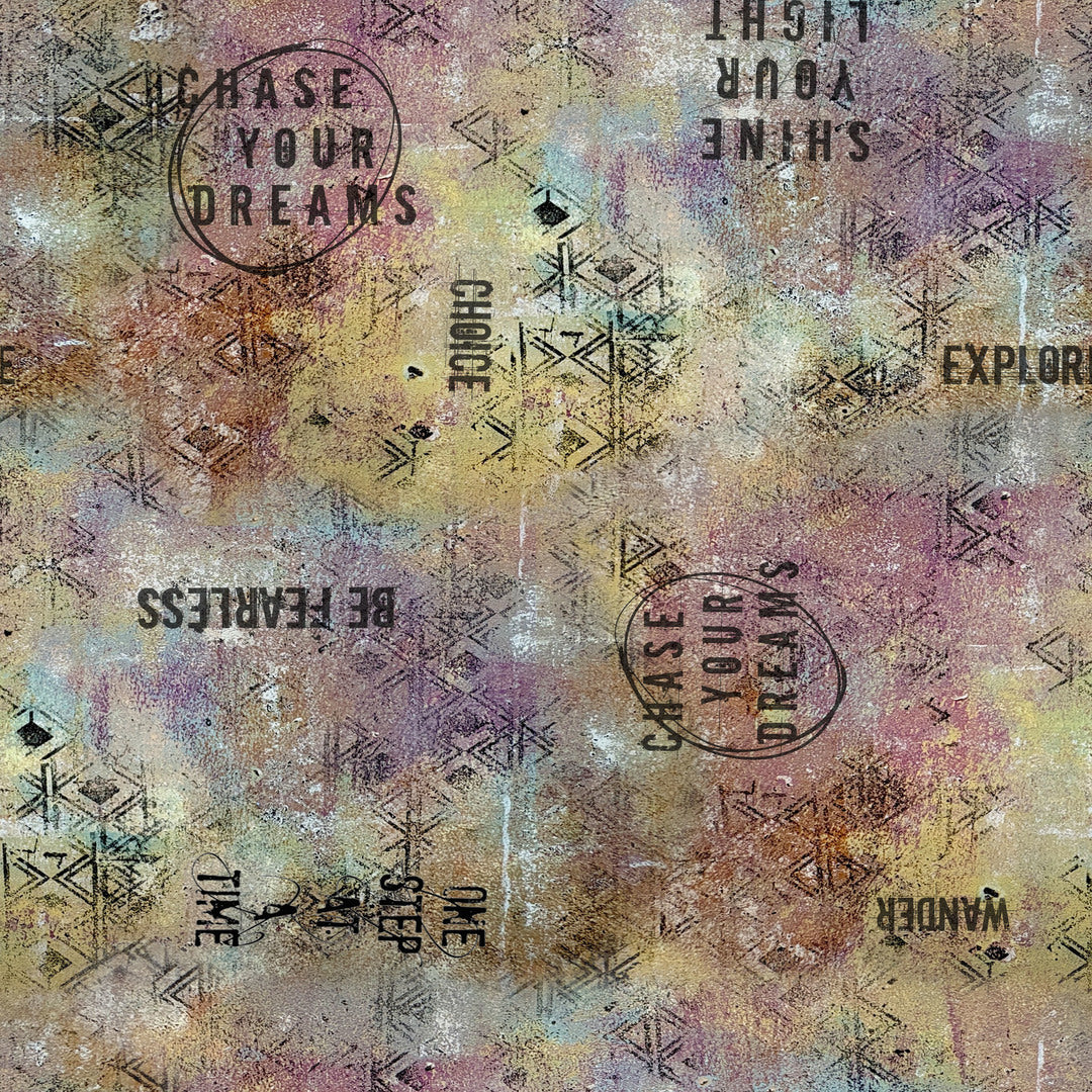 The soft lilac, earthy tan, and muted pops of color create an artful, weathered look that pairs beautifully with modern quilts. Great for quilt backs, borders, and statement pieces in bags, garments, and home décor.