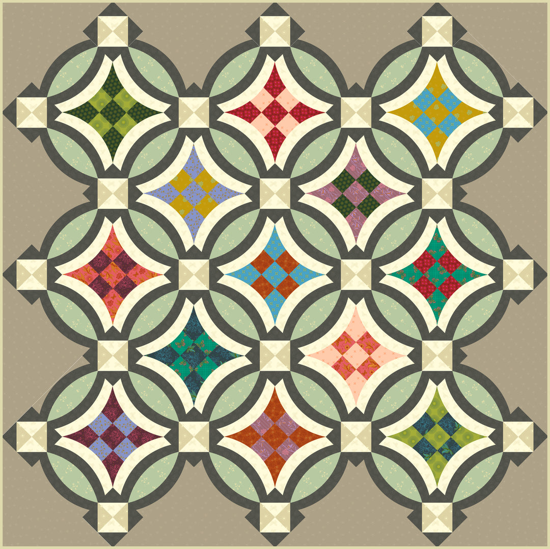 SEW KIND OF WONDERFUL - Nine Patch Revival Pattern is a gorgeous quilt design and Field Cloth fabrics looks like stained glass windows when combined in this traditional quilt design! Easy curved piecing, quarter square triangle blocks, and nine patch blocks create a timeless heirloom quilt. No pinning, no centering, no stressing! The perfect project for every maker!