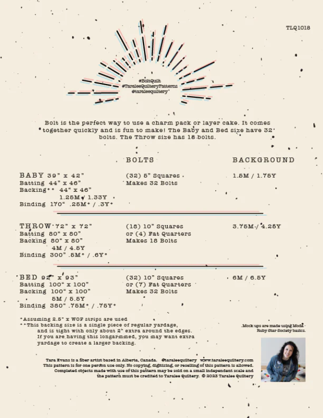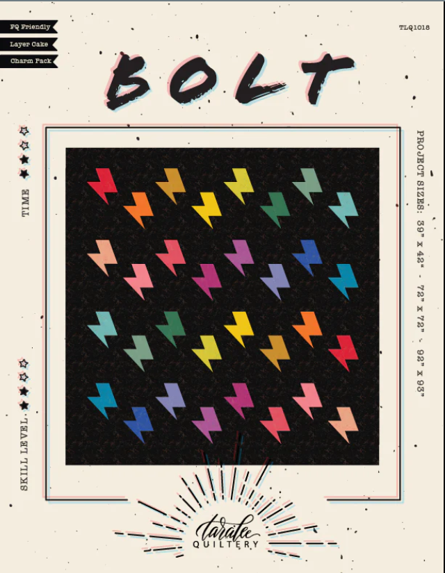 TARA LEE QUILTERY - BOLTS PATTERN is the perfect way to use a charm pack or layer cake. The Baby size uses a charm pack and some background, while the Throw and Bed sizes use a layer cake or fat quarters. Fabric pieces are cut with templates included within the pattern.