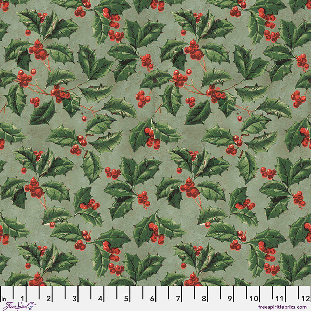 TIM HOLTZ - PALETTE SEASONAL CANVAS CLOTH - Christmas Holly is part of Palette Seasonal Canvas Cloth by Tim Holtz, featuring vintage-style holly leaves and bright red berries scattered across a muted green background for a timeless holiday look.