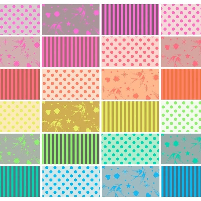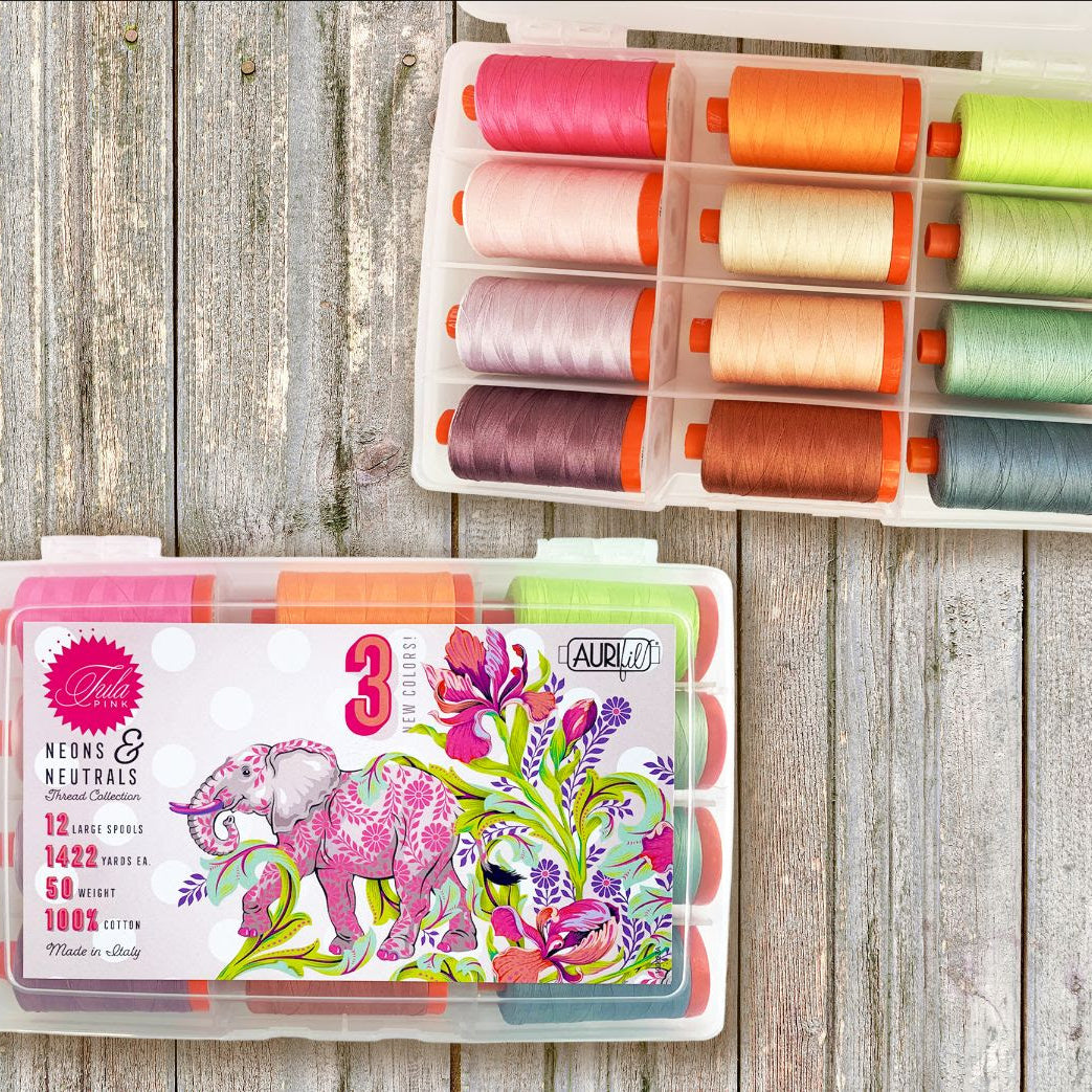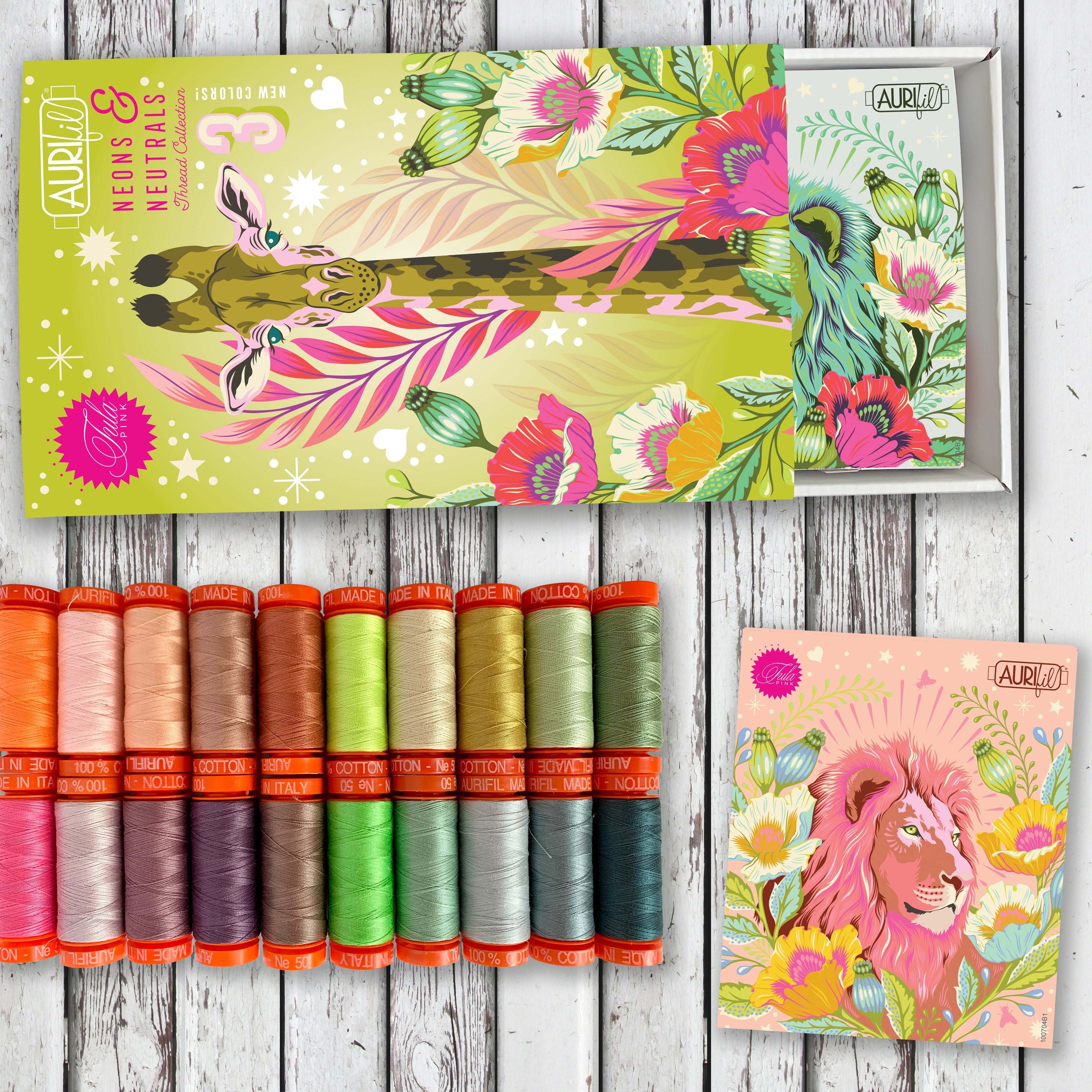 TULA PINK - EVERGLOW animals are centered around those that would naturally occur in those palettes. Tula created golden giraffes in “Neck for Days”, blue grey elephants in “All Ears”, silver Hippos in “My Hippos don’t Lie” and coppery lions in “Good Hair Day”. Each animal is represented in a more accurate color palette and a contrasting color palette that is other worldly!