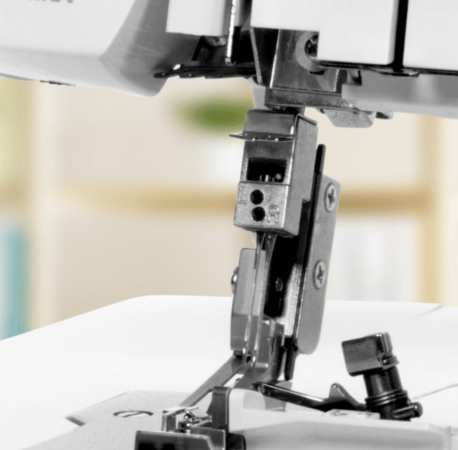 The manual Needle Threader allows for easy and ergonomic threading. It is simple to thread the lower looper thanks to the lower looper threader. The color-coded threading path and the handwheel positioning window help you thread quickly. For your convenience, there is a thread cutter on the left cover.