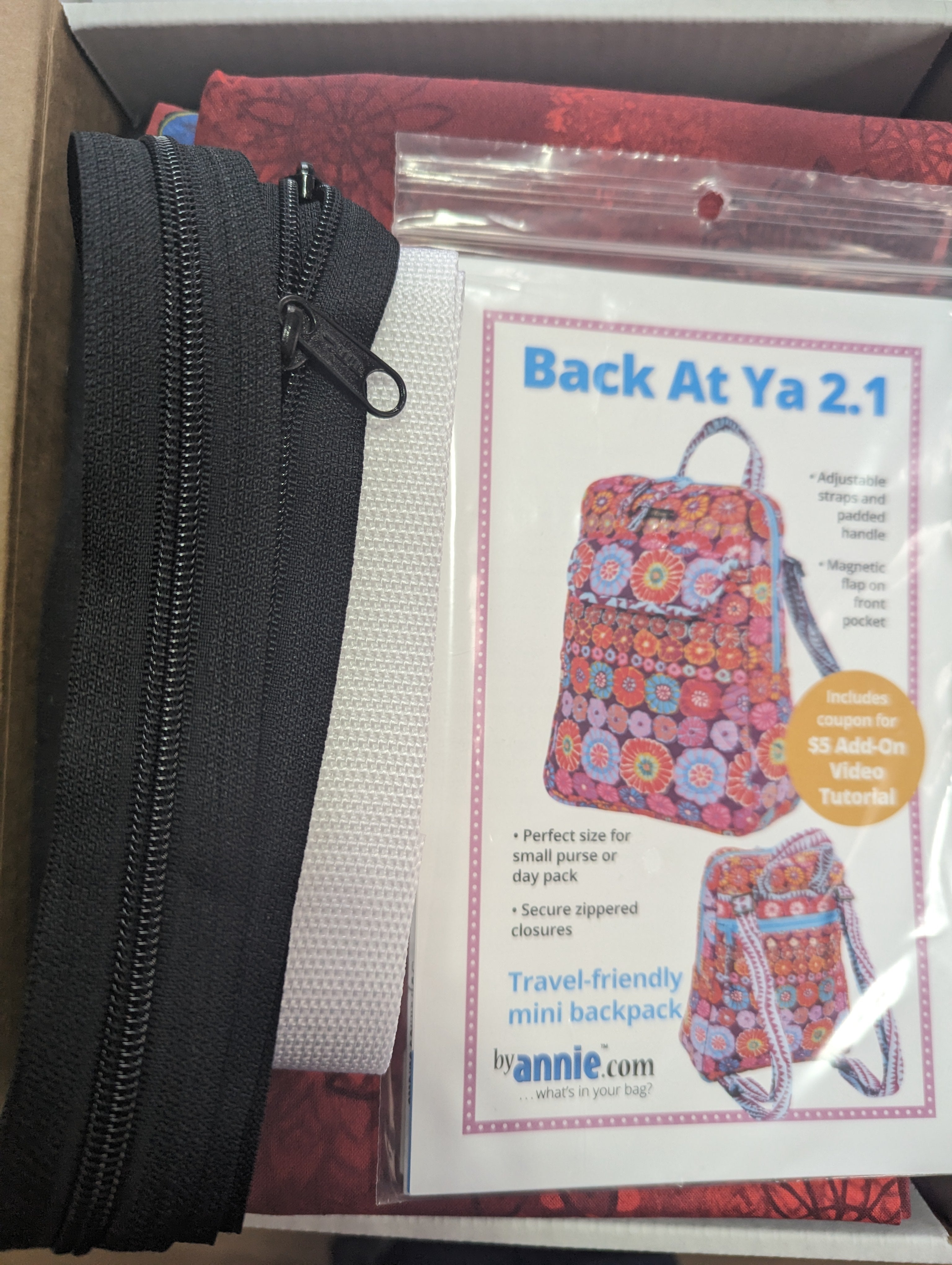 This kit contains 3 meters of Quilting Cotton Fabrics, zippers in coordinated color. The kit includes printed ByAnnie Pattern and 1 piece 36" by 58" of Soft and Stable, 1 piece of interfacing, web strapping, and hardware