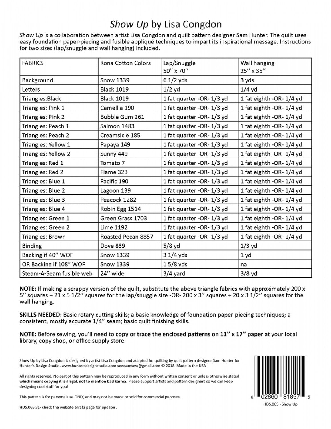 Hunter's Design Studio - Show Up is a collaboration between artist Lisa Congdon and quilt pattern designer Sam Hunter. The quilt uses easy paper-piecing and fusible applique techniques to impart its inspirational message. Instructions for two sizes (lap/snuggle and wall-hanging) included.