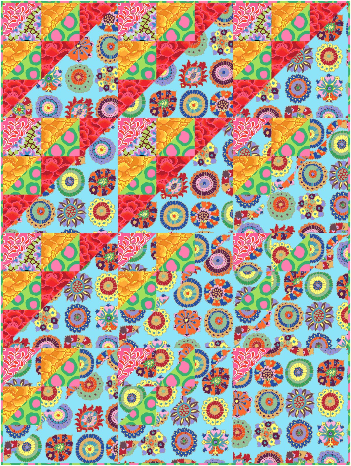 KAFFE FASSETT COLLECTIVE - KFC FEBRUARY 2023 - Cascade Quilt Kit Just six fabrics and some simple blocks provide a fun combination for color to cascade (get it?!) across your quilt. The Tucker Trimmer 1 and Tucker Trimmer 3 are recommended, but not required.