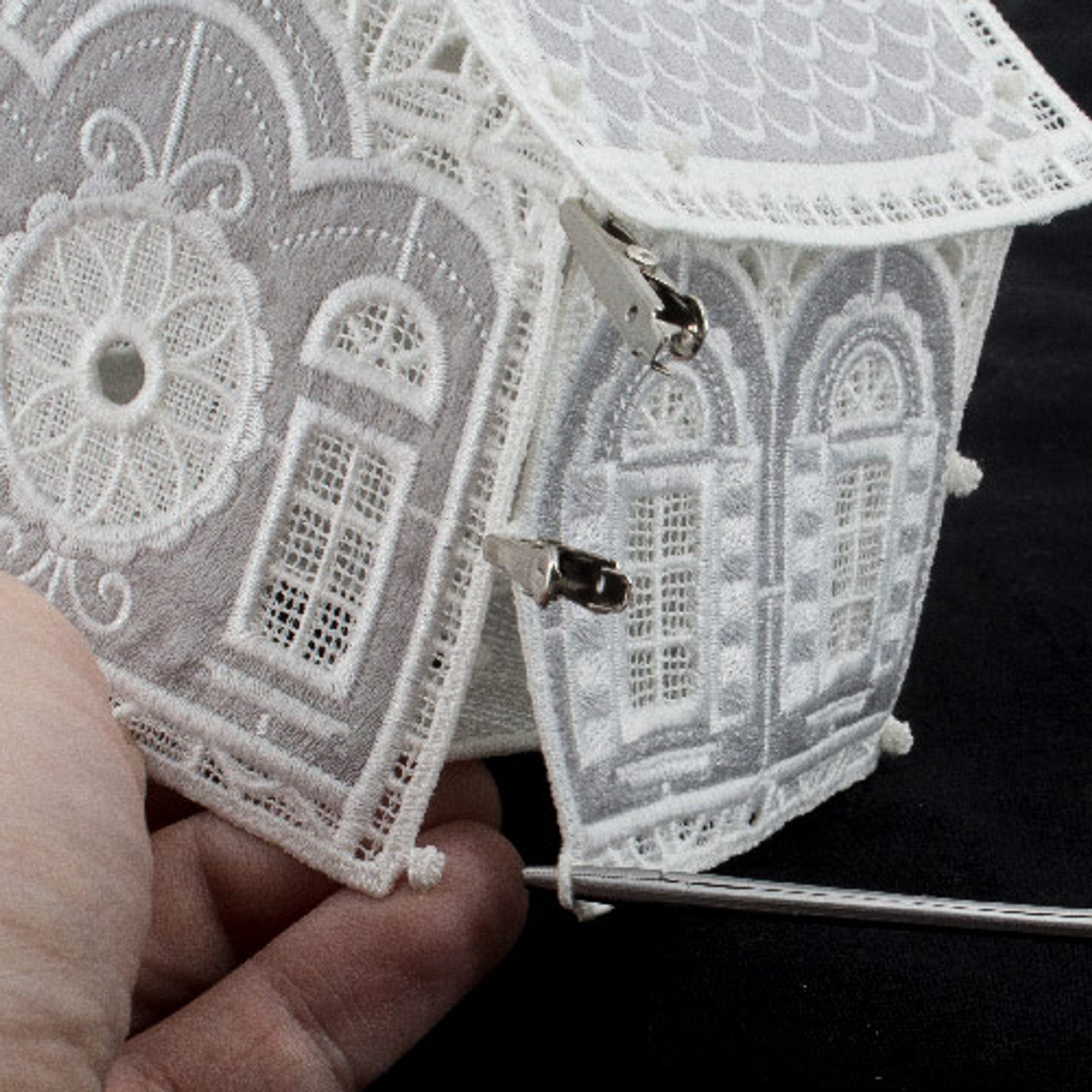 OESD - Button Clips 10/pk (also called alligator clips) help make freestanding lace assembly a pinch. Place the button clip over an assembled loop and button to temporarily secure the connection while you complete other areas of the structure. 10 button clips per package.